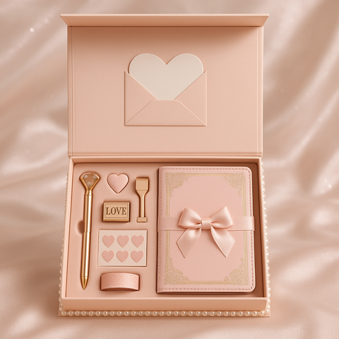 دفتر ملاحظات LABON الرومانسي باللون الذهبي الوردي مع ملصقات على شكل قلب وخواتم قلم ومجلة بشريط في صندوق بحافة اللؤلؤ